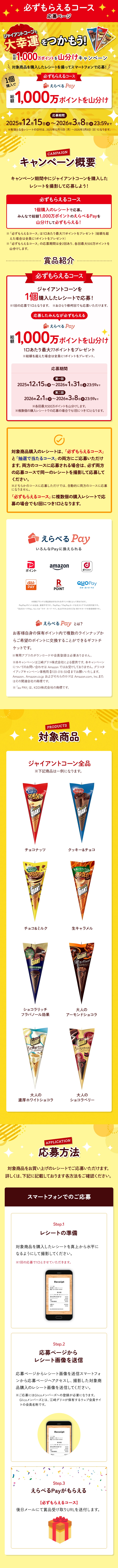 江崎グリコ株式会社(以下「当社」といいます)が実施するキャンペーン「ジャイアントコーンで大幸運をつかもう!総額1,000万ポイントを山分けキャンペーン」(以下「本キャンペーン」といいます)にご応募いただく前に、本規約をよくお読みください。なお、本キャンペーンにご応募いただいた方(以下「応募者」といいます)は、ご応募いただいた時点で、以下の内容にご同意いただいたものとみなします。